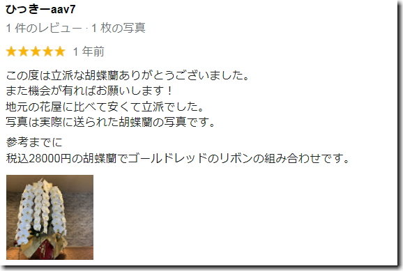 | 価格 | スタンド花1.3万円~、胡蝶蘭1万円~ |