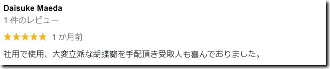 | 価格 | スタンド花16500円~、胡蝶蘭17600円~ |